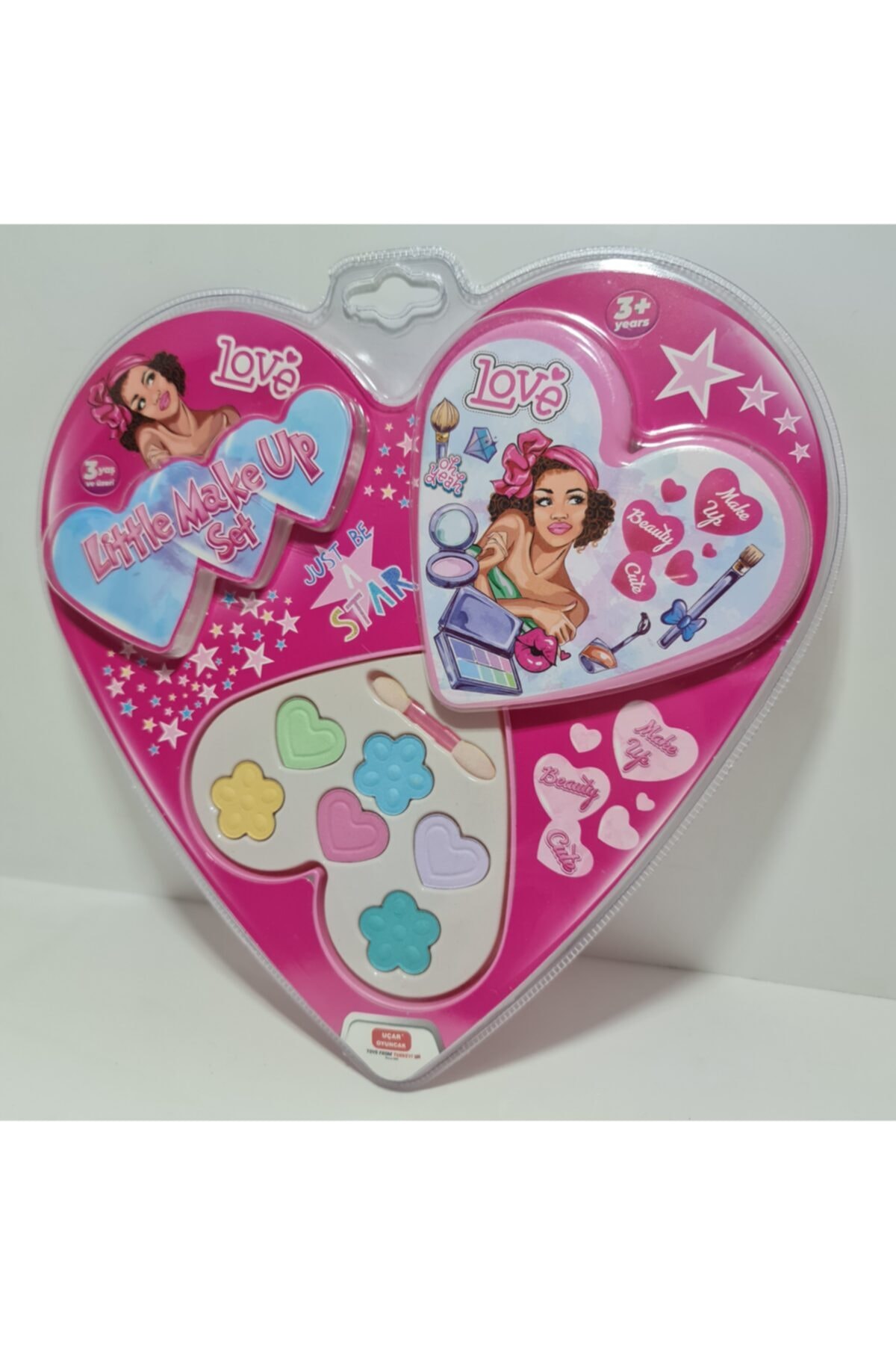 ÜRÜN AÇIKLAMASI: 6 adet far ile oluşan süngerli fırçası ile 6 farklı tonlarda toz farlar sayesinde Makyaj yapma zamanı. Çocuklar için uygun boya, hammadde ve makyaj kozmetiği kullanılmıştır. ÜRÜN ÖZELLİKLERİ: -Kullanım yaşı +18 Ay ; -Metal parçalar vida vs. içermez. ; -Çocuk sağlığına uygun plastik ve boyalardan üretilmiştir. ; ÜRÜN İÇİNDEKİ BAŞLICA PARÇALAR: 6 adet farklı renk tonlarında toz far ; 1 adet çift yönlü sünger uçlu makyaj fırçası ; 2 kapaklı baskılı IML etiketli kalp formunda plastik kapak ;